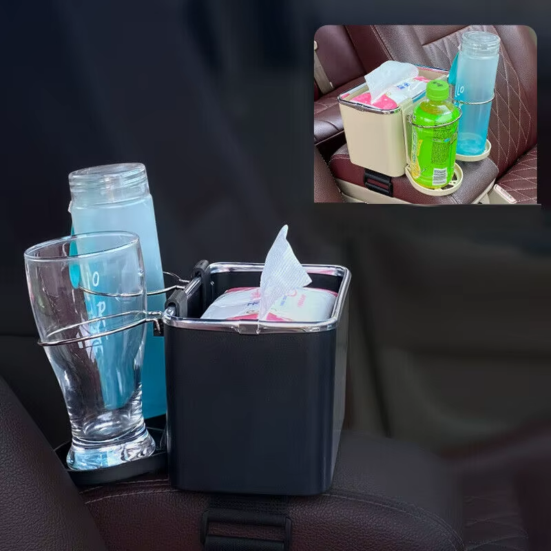O Baú Organizador Premium conta com 2 porta copos que vão estar disponíveis para segurar as suas bebidas favoritas e te ajudar a não derramar nenhuma bebida dentro do seu carro.